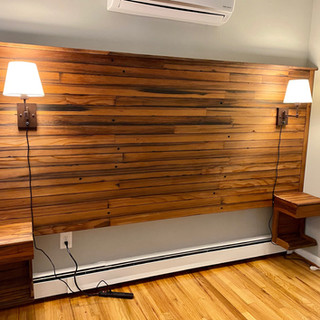 I enjoyed this project! Working with reclaimed is always a treat and working with this reclaimed redwood from an old water tower in NYC feels pretty special. This king size headboard includes two custom side tables built in with lighting. I was happy to install it and see it bring the room to life!